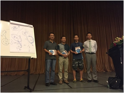 幸運學員手持優(yōu)制咨詢贈送的精益運營管理書籍與姜老師合影