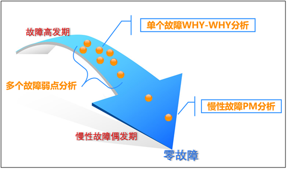 4、在消除了絕大多數故障后,設備進入慢性故障的偶發期,這時候需要使用PM原理分析來徹底消除這些慢性故障。