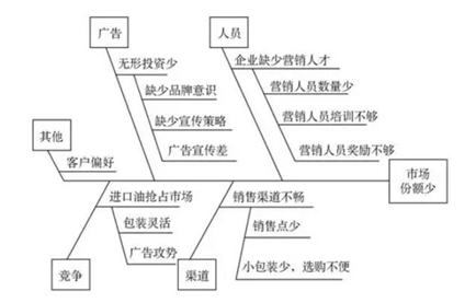 圖中的“魚頭”表示需要解決的問題,即該煉油廠產(chǎn)品在市場(chǎng)中所占份額少。根據(jù)現(xiàn)場(chǎng)調(diào)查,可以把產(chǎn)生該煉油廠市場(chǎng)營(yíng)銷問題的原因,概括為5類。即人員、渠道、廣告、競(jìng)爭(zhēng)和其它。在每一類中包括若干造成這些原因的可能因素,如營(yíng)銷人員數(shù)量少、銷售點(diǎn)少、缺少宣傳策略、進(jìn)口油廣告攻勢(shì)等。