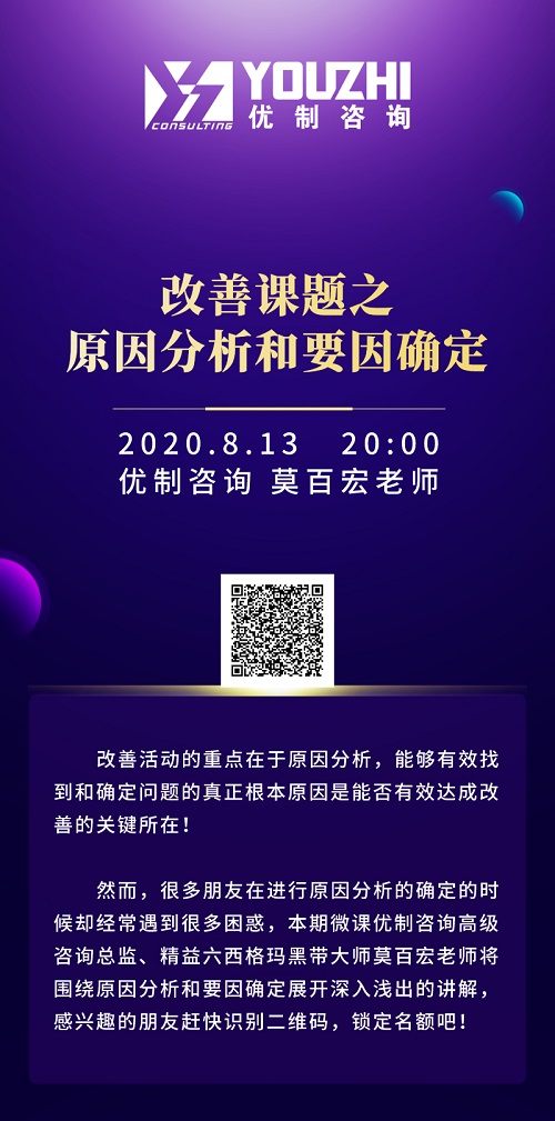 改善活動的重點在于原因分析,能夠有效找到和確定問題的真正根本原因是能否有效達(dá)成改善的關(guān)鍵所在!然而,很多朋友在進(jìn)行原因分析的確定的時候卻經(jīng)常遇到很多困惑,本期微課,優(yōu)制咨詢咨詢總監(jiān)、精益六西格瑪黑帶大師莫百宏老師將圍繞原因分析和要因確定展開深入淺出的講解。