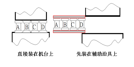 某模具有“A、B、C、D”四個組成部分,換模時需要逐個裝入設備;某改善小組應用輔助治具,在換模前將“A、B、C、D”四個部分先裝入輔助治具,換模時直接裝入設備,成功實現內部作業向外部作業轉化;示意圖如下: